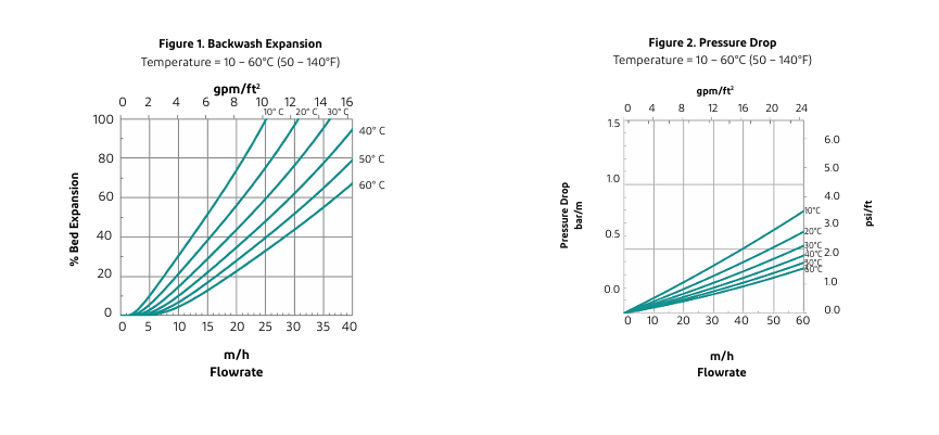 Độ giãn nở lớp nhựa của DuPont™ AmberLite™ IRC120 Na được ước tính dựa trên lưu lượng nước rửa ngược (backwash) và nhiệt độ, thể hiện ở Hình 1.