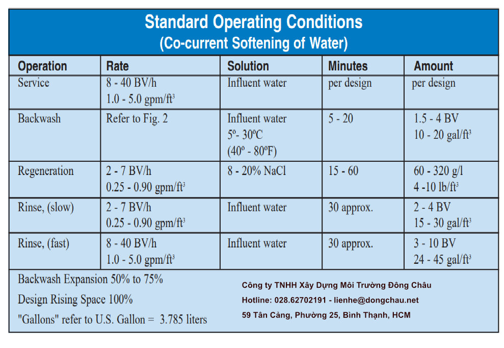 • Bước 4: Sau khi áp dụng "hệ số thiết kế" thông thường là 90%, giá trị công suất thiết kế trích dẫn có thể là 1,25 eq/l, tương đương với 27,3 kgr/ft³ (1,25 eq/l x 21,85 kgr/ft³/eq/l).
