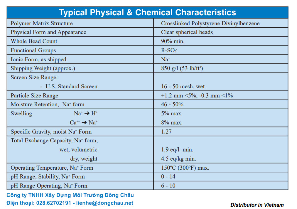 • Tổng dung lượng trao đổi: ≥ 2,0 eq/L (dạng Na+)